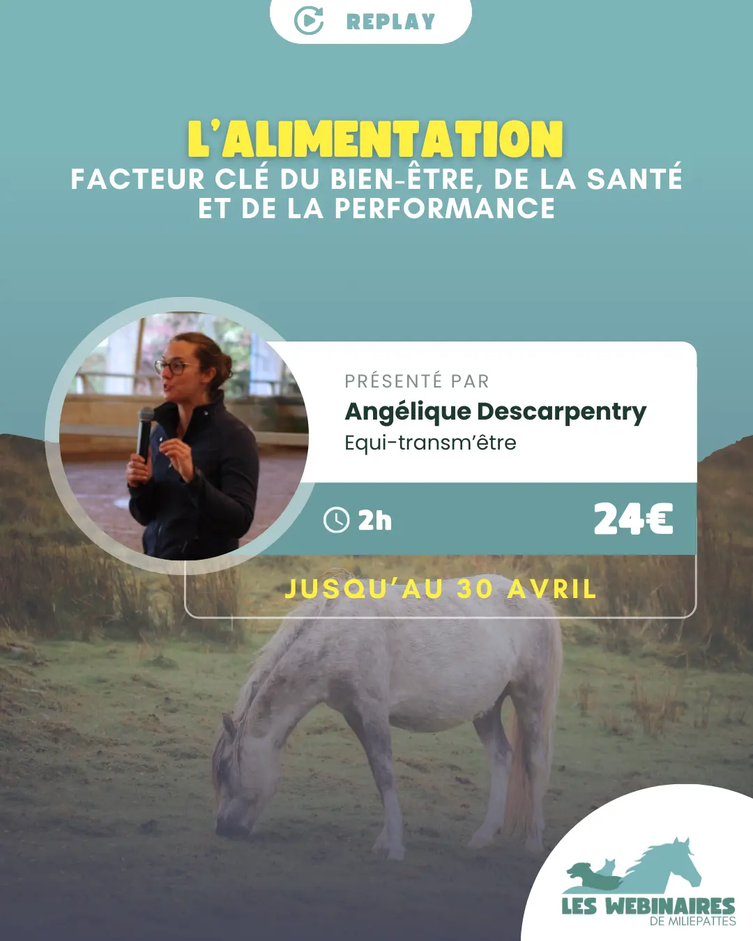 Angélique – Equi-transm’être est ingénieure agronome et nutritionniste équin. Dans ce webinaire, elle t’aidera à mieux comprendre les besoins du cheval en terme d’alimentation mais aussi de comportements alimentaires.