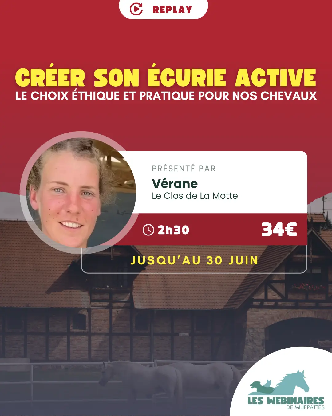 Rejoins Vérane, gérante des écuries du Clos de la Motte dans ce webinaire de 2h30 ! Après des années à travailler en tant qu’ingénieure, elle s’est tournée vers l’optimisation pour le cheval et l’humain en créant cette écurie. Trésor, le cheval de ta Miliepattes préférée, y séjourne pour leur plus grand bonheur !
